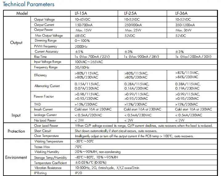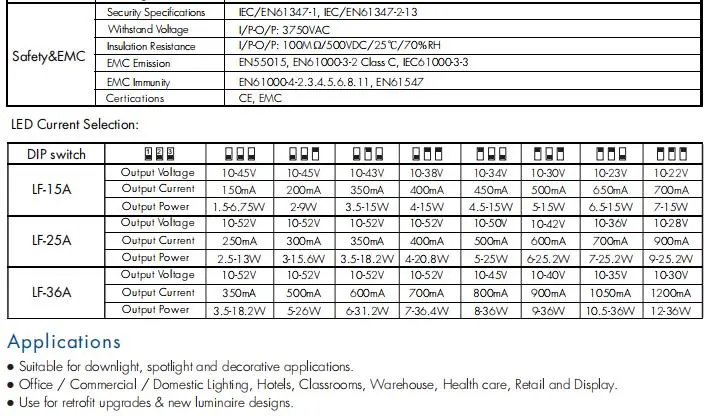 Conformità automatica della tensione: il driver regola automaticamente la tensione di uscita per soddisfare i requisiti di tensione diretta del carico LED collegato, entro l'intervallo specificato (ad esempio, 12-24 V CC, 20-40 V CC).