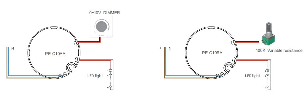 1. Differenza tra pe-c10aa e pe-c10ra: pe-c10aa è un dimming 0-10 V / 1-10 V / PWM e pe-c10ra è un dimming speciale per una resistenza variabile di 100 k 2. I parametri misurati vengono eseguiti in un ambiente di ingresso 230 V CA di 25 gradi 3. Alimentazione a corrente costante, nello stato non dimmerabile, la corrente di uscita è il valore massimo impostato 4. La tensione collegata alla lampada deve rientrare nell'intervallo di tensione contrassegnato dell'alimentatore 5. Questo prodotto adotta il processo di dissipazione del calore del gel di silice a conduzione termica per bilanciare la temperatura interna e garantire la sicurezza e l'affidabilità del prodotto 6. Distanza di prova della linea del segnale: linea schermata da 1,5 m2, 200 m con 40 alimentatori. A causa del fattore distanza, la distanza verrà allungata e il numero di controlli verrà ridotto. La lunghezza della linea del segnale è L'aumento porterà al segnale attenuazione, quindi il numero di lampade controllabili diminuirà con l'aumento della distanza di controllo |