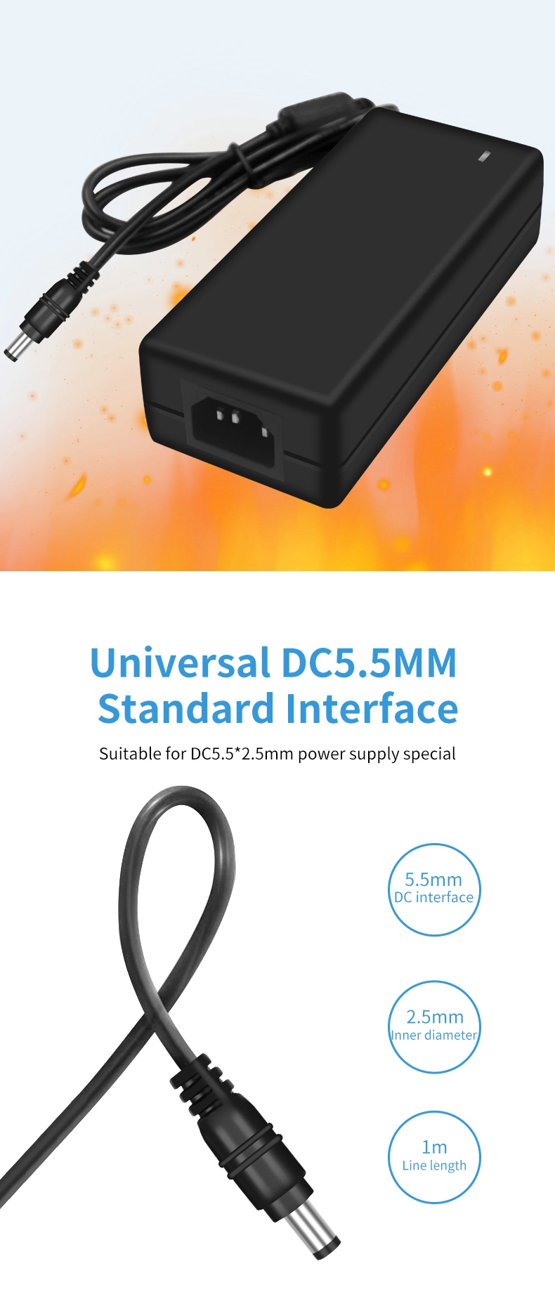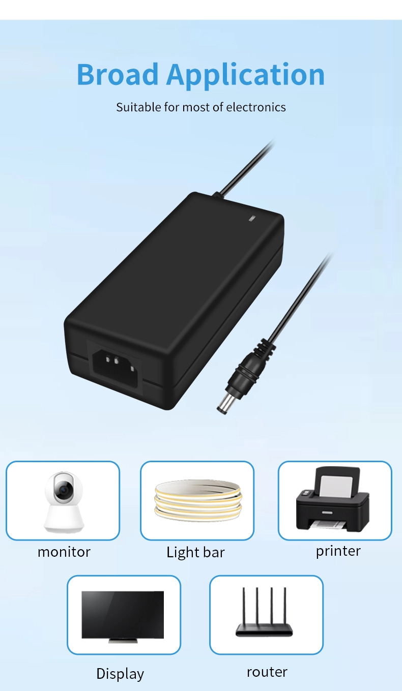 L'ampio ingresso di tensione CA 100-240 V è compatibile con le reti elettriche di oltre 100 paesi in tutto il mondo. Il cavo di uscita esteso da 1,5 m (diametro 1,0 mm²) abbinato a un connettore CC ruotabile di 180° si adatta a vari scenari di installazione. Con dimensioni compatte di soli 120×60×30 mm, è più piccolo del 35% rispetto agli adattatori tradizionali della stessa potenza e pesa solo 280 g, migliorando la portabilità del 50%.