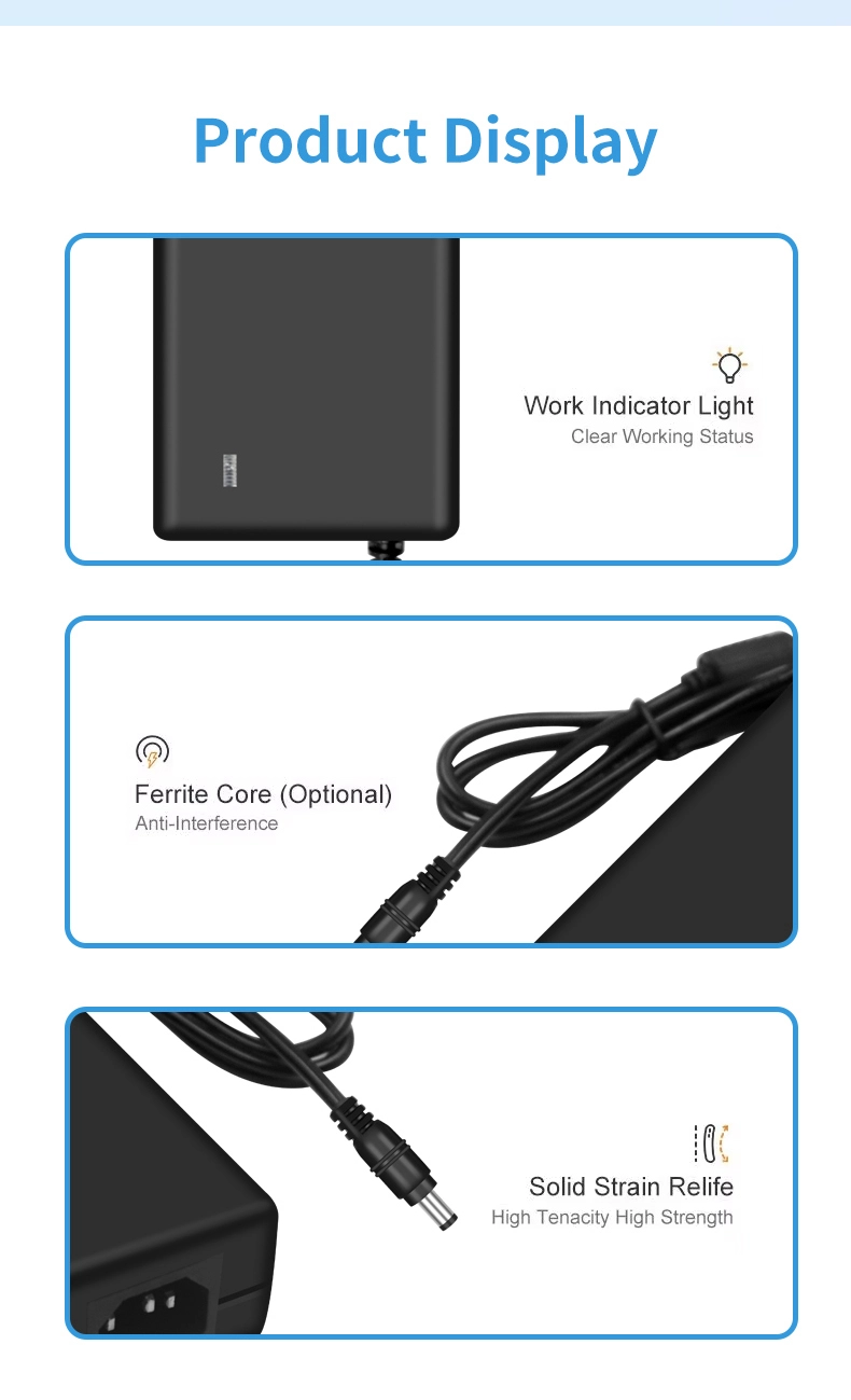 Con una potenza nominale di 96 W, la corrente di uscita dell'alimentatore da 96 W si stabilizza a un picco di 8 A e la precisione della tensione è controllata entro ±5% (tensione a vuoto: 12,1 V; tensione a pieno carico: 11,8 V). Può soddisfare le esigenze di alimentazione simultanea di più dispositivi (ad esempio, 2 dispositivi paralleli da 48 W). Il cavo di uscita con nucleo in rame puro garantisce una caduta di tensione di ≤0,3 V, mantenendo prestazioni inalterate durante la trasmissione ad alta corrente.