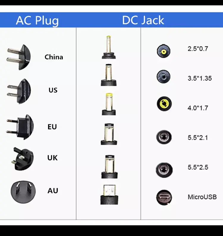 Tipo di connettore: connettore a cilindro CC standard (le dimensioni comuni includono 5,5 mm x 2,1 mm o 5,5 mm x 2,5 mm, personalizzabili in base ai requisiti del dispositivo).