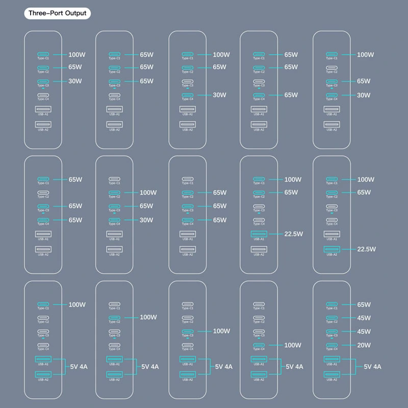 Uscita USB C1/C2/C3/C4: 5 V/3 A 9 V/3 A 12 V/3 A 15 V/3 A 20 V/5 A (100 W massimo) USB A1/A2: 5 V/3 A 9 V/2 A 12 V/1,5 A (18 W massimo) |