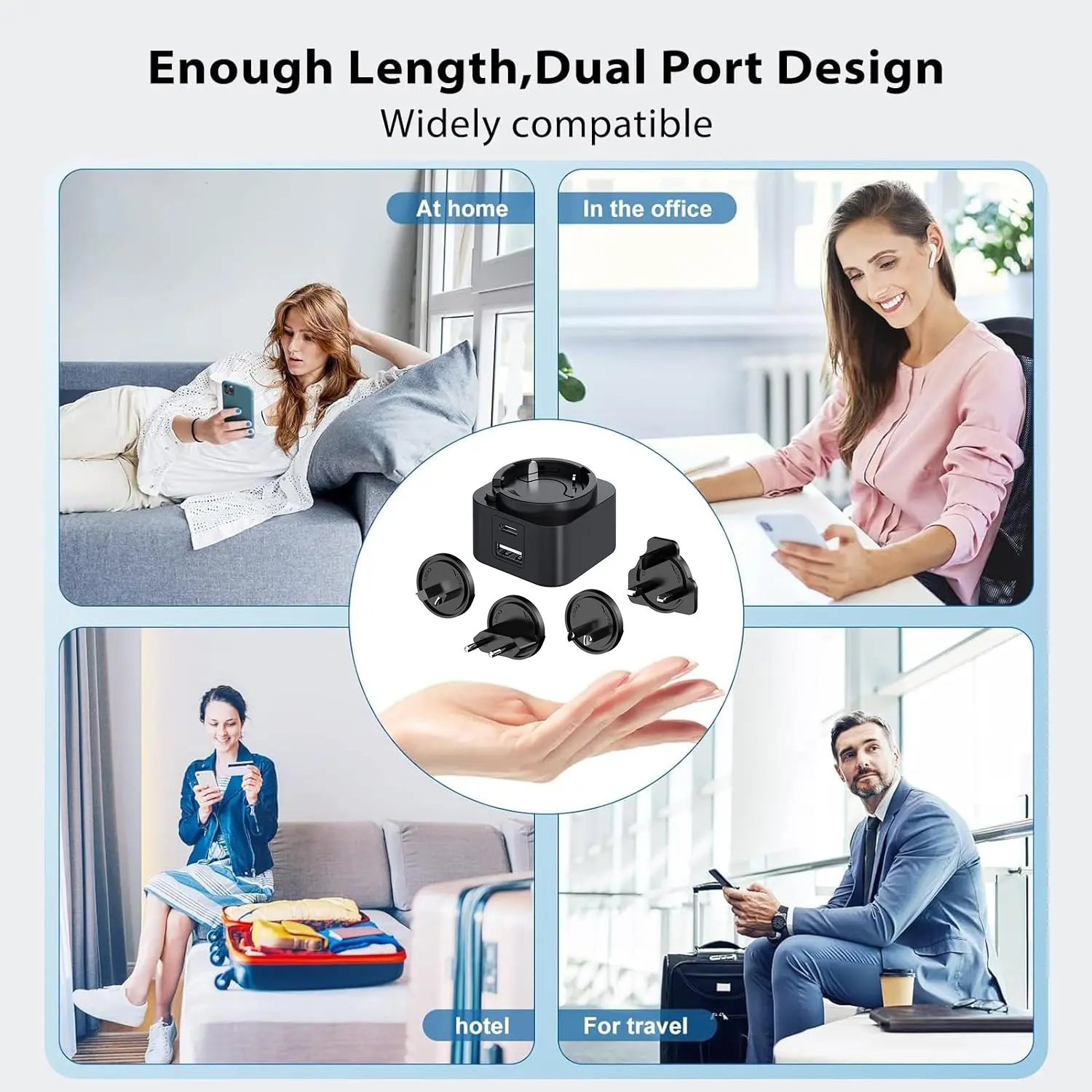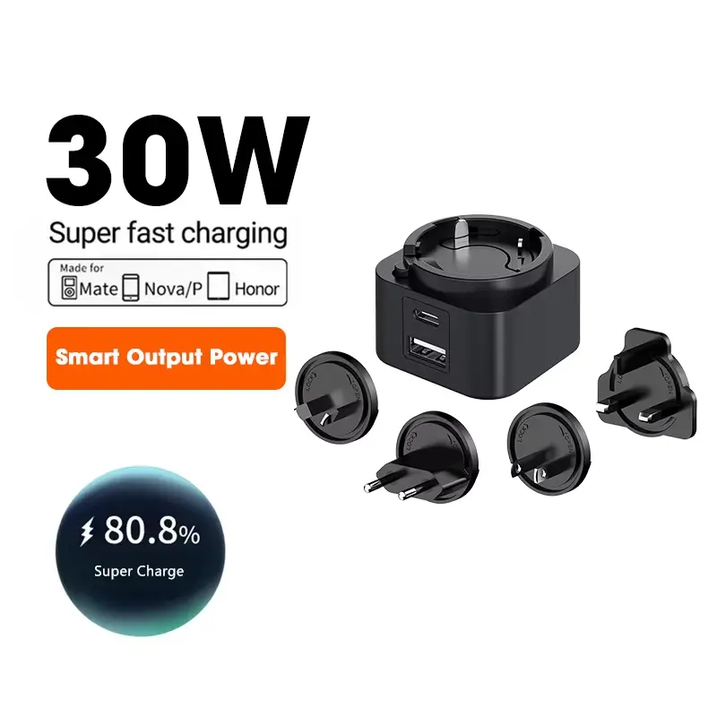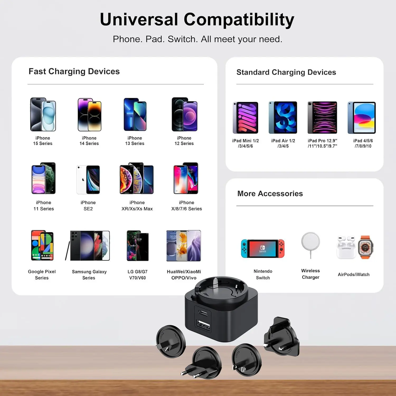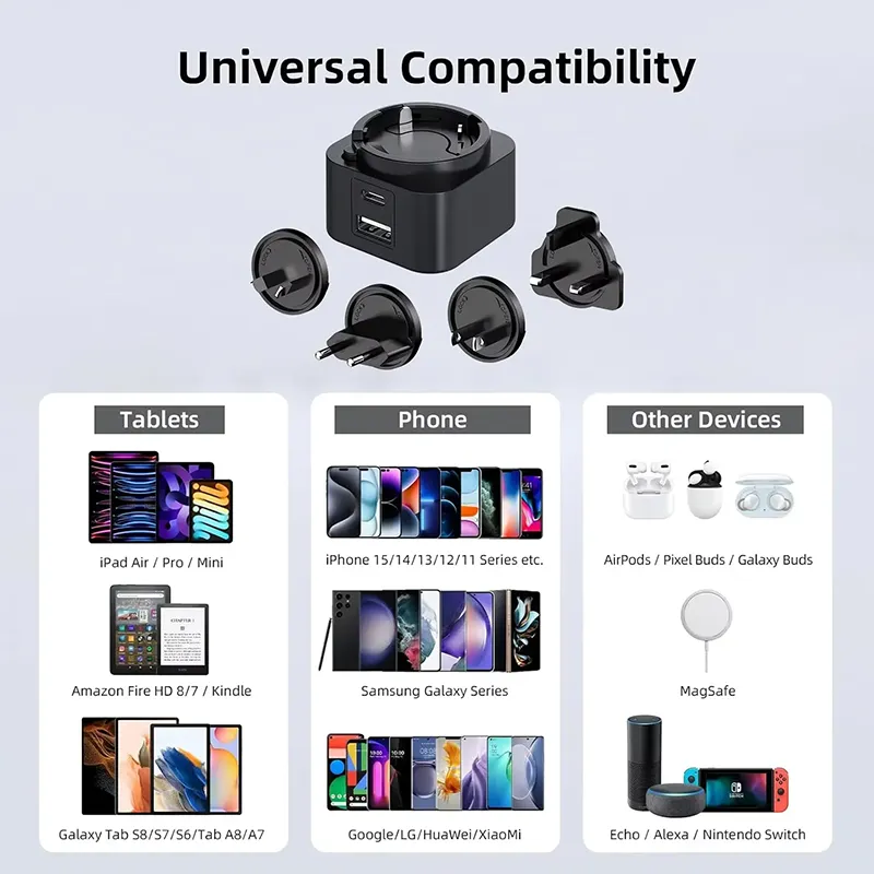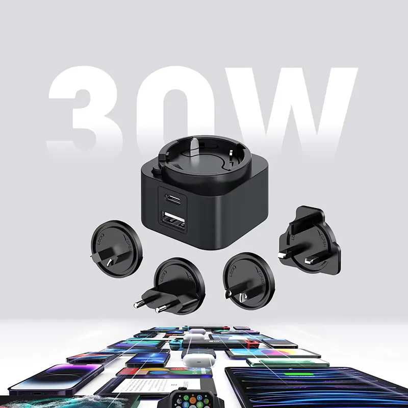 La versatilità è fondamentale. Il design a doppia porta (USB-C/USB-A) consente di caricare due dispositivi contemporaneamente. Il caricabatterie PD con spina intercambiabile da 30 W è dotato di un set di spine intercambiabili (US/EU/UK/AU), che lo rendono il tuo compagno di viaggio perfetto in tutto il mondo. Che tu stia caricando uno smartphone, un tablet o un laptop, la compatibilità universale garantisce prestazioni di alto livello.