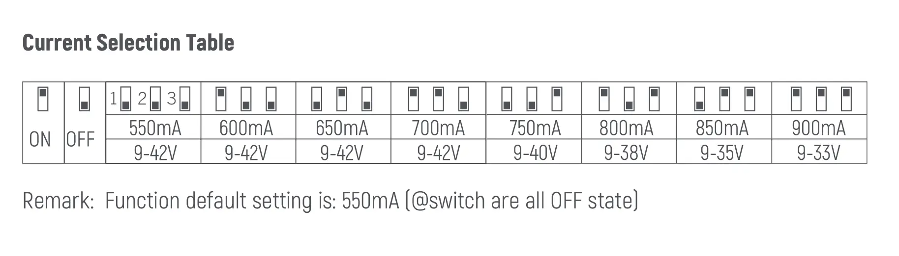Corrente di uscita: regolabile, vedere la tabella di selezione della corrente per i dettagli