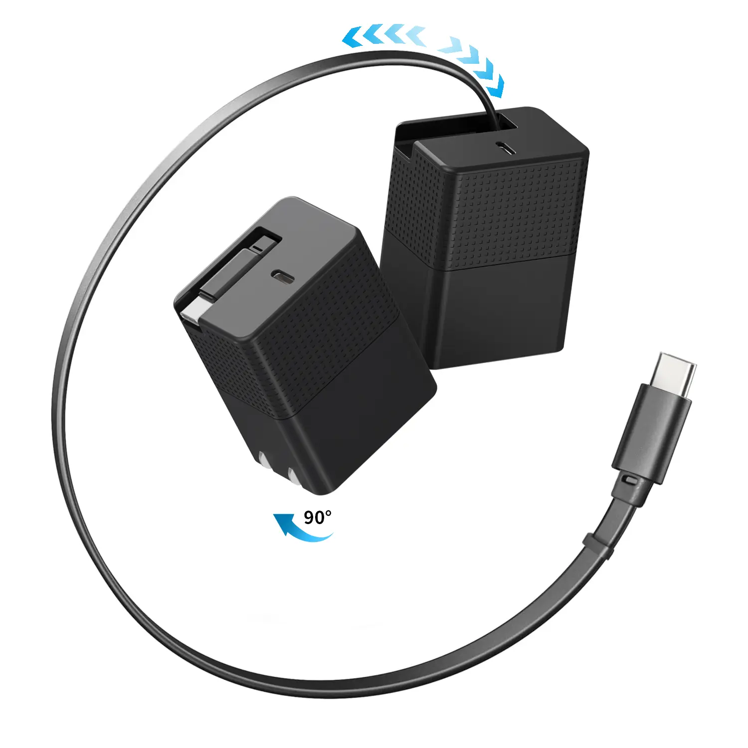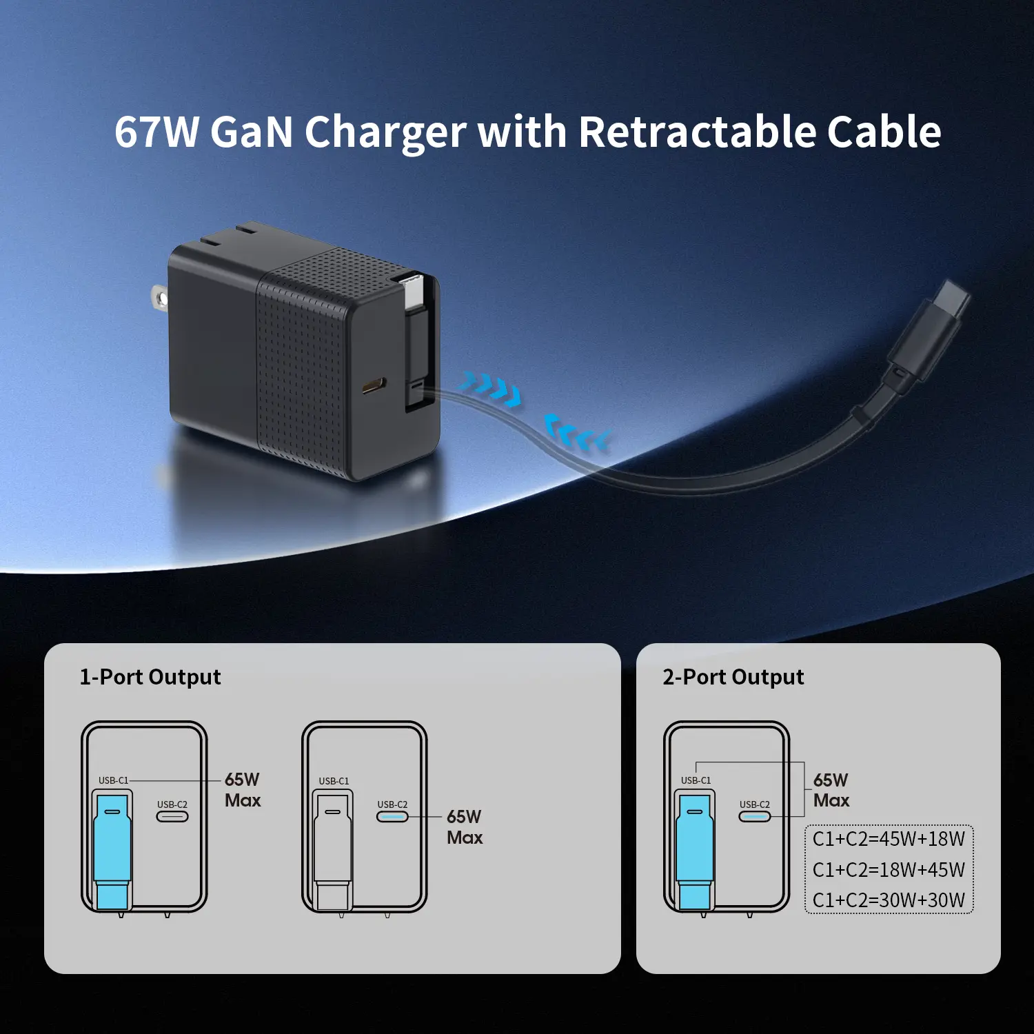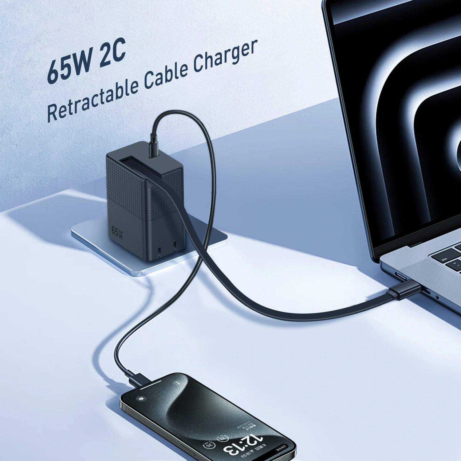 Dotato di cavi retrattili: l'adattatore di ricarica rapida da 65 W è dotato di un comodo cavo dati USB-C lungo 1 metro (2,3 piedi). Questo cavo può estendersi e ritrarsi senza problemi, evitando così l'ingombro di cavi aggrovigliati e garantendo la possibilità di ricarica in qualsiasi momento.