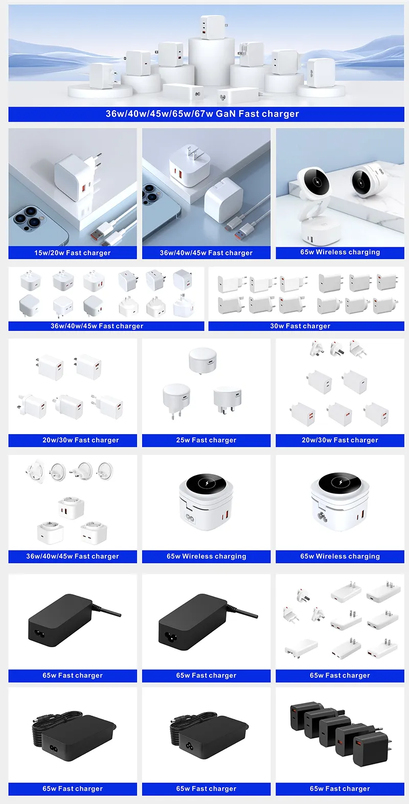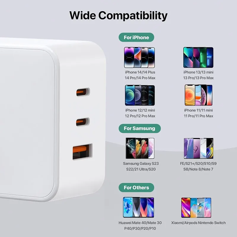 Questo caricabatterie fornisce fino a 65 W di potenza costante e carica in modo efficiente laptop (ad esempio MacBook Air/Pro, Dell XPS), tablet, smartphone (iPhone, Samsung Galaxy) e altri dispositivi che supportano il protocollo PD. Il suo design compatto e leggero lo rende ideale per i viaggi, mentre la protezione integrata da sovratensione, sovracorrente e cortocircuito garantisce una ricarica sicura del caricabatterie e dei dispositivi collegati. Di solito è dotato di 1-2 interfacce USB-C, che supportano la ricarica di più piccoli dispositivi contemporaneamente, bilanciando potenza e praticità.